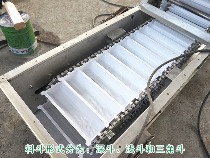 三角形料斗:深斗是具有導向側邊的三角形料斗,這種料斗在提升機中采用一個接一個的密集布置,當繞過上鏈輪卸料時,前一個料斗的兩導向側邊和前壁形成后一個料斗的卸載導槽,這種料斗適于輸送較重的、半磨琢性的、磨琢性大的塊狀物料。