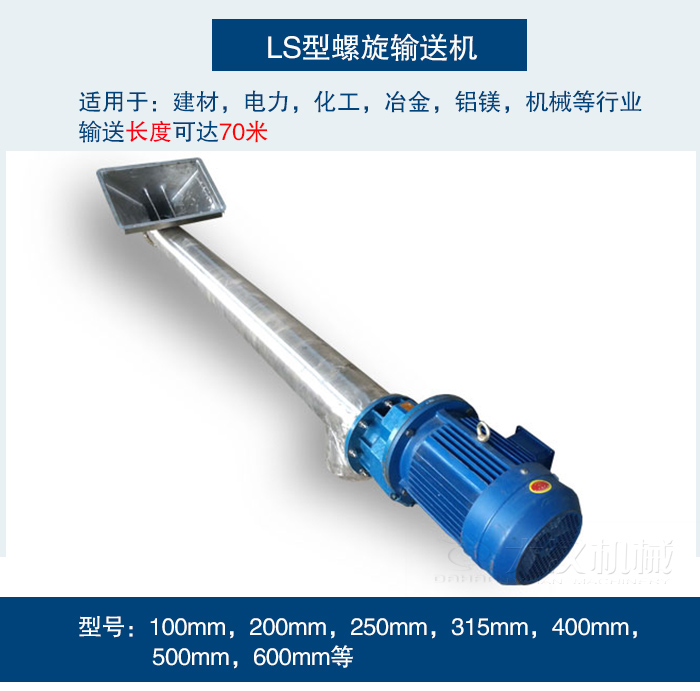 型號(hào):LS型螺旋輸送機(jī)以管徑為型號(hào):100mm,200mm,250mm,315mm,400mm,500mm,600mm等型號(hào)。
