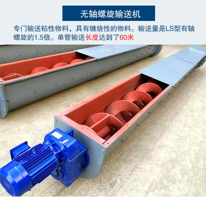 無軸螺旋輸送機(jī)又是,在LS型螺旋輸送機(jī)的基礎(chǔ)上進(jìn)行改進(jìn)的。由于LS型螺旋輸送機(jī)結(jié)構(gòu)所以無法輸送一些,有粘性和纏繞性的物料。所以就出現(xiàn)了無軸螺旋輸送機(jī)。因此無軸螺旋輸送機(jī)就成為了專門輸送一些,粘性物料,具有纏繞性的物料。無軸螺旋輸送機(jī)不僅在物料上有所突破,在輸送量上也超過了LS型有軸螺旋的1.5倍。并且單管輸送長(zhǎng)度達(dá)到了60米的輸送距離。