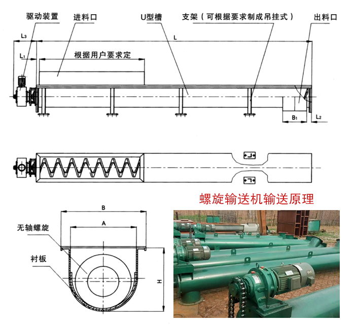 螺旋輸送機(jī)一般由輸送機(jī)本體、進(jìn)出料口及驅(qū)動(dòng)裝置三大部分組成;螺旋輸送機(jī)的螺旋葉片有實(shí)體螺旋面、帶式螺旋面和葉片螺旋面三種形式,其中,葉片式螺旋面應(yīng)用相對(duì)較少,主要用于輸送粘度較大和可壓縮性物料,這種螺懸面型,在完成輸送作業(yè)過(guò)程中,同時(shí)具有并完成對(duì)物料的攪拌、混合等功能。
