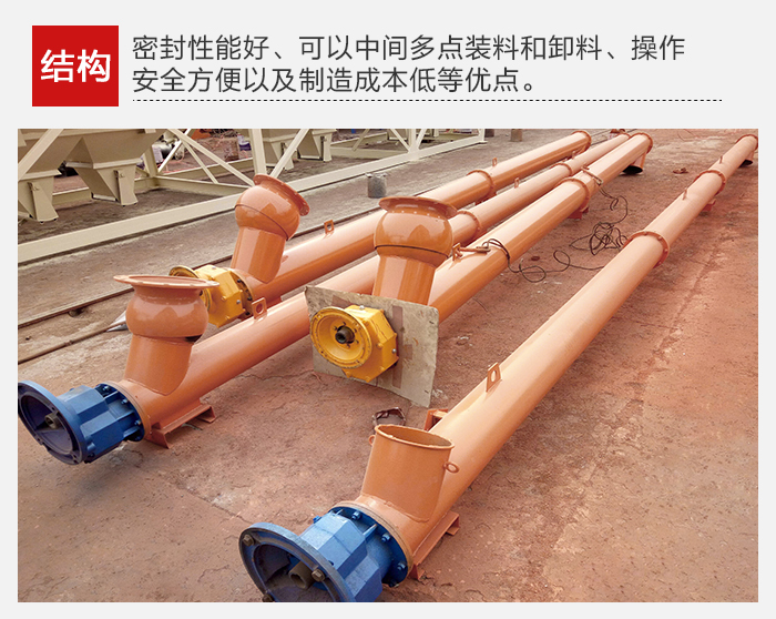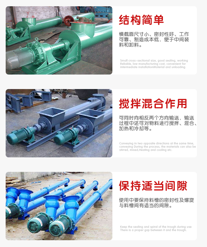 結(jié)構(gòu)簡(jiǎn)單、橫截面尺寸小、密封性好、工作可靠、制造成本低,便于中間裝料和卸料,輸送方向可逆向,也可同時(shí)向相反兩個(gè)方向輸送。輸送過(guò)程中還可對(duì)物料進(jìn)行攪拌、混合、加熱和冷卻等作業(yè)。通過(guò)裝卸閘門(mén)可調(diào)節(jié)物料流量。但不宜輸送易變質(zhì)的、粘性大的、易結(jié)塊的及大塊的物料。輸送過(guò)程中物料易破碎,螺旋及料槽易磨損。單位功率較大。使用中要保持料槽的密封性及螺旋與料槽間有適當(dāng)?shù)拈g隙。