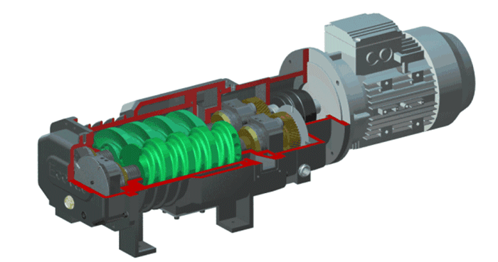 雙軸螺旋輸送機工作時,物料從進料口進入,兩根螺旋軸相反方向轉動時(一根左旋,一根右旋,可避免物料堵塞),物料在螺旋葉片的推力以及物料與葉片產生的摩擦力作用下,物料伴隨螺旋葉片的向前推動而沿著料槽向前移動,直至出料口排出;在輸送過程中,還同時可對物料進行攪拌和破碎。