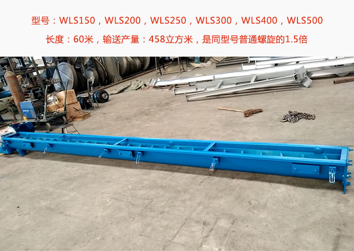 無(wú)軸螺旋輸送機(jī)常規(guī)型號(hào)有WLS150,WLS200,WLS250,WLS300,WLS400,WLS500等6種規(guī)格可選,單機(jī)長(zhǎng)度60米,輸送產(chǎn)量高達(dá)458立方米,是同型號(hào)普通螺旋的1.5倍;可輸送帶狀、黏稠物料、易纏繞物料;具體參數(shù)如下: