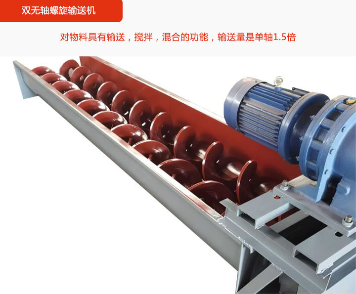 雙無(wú)軸螺旋輸送機(jī):采用兩根螺旋軸組成,且軸旋轉(zhuǎn)方向相反,輸送物料同時(shí)還可對(duì)物料攪拌,混合,其輸送量是單軸1.5倍