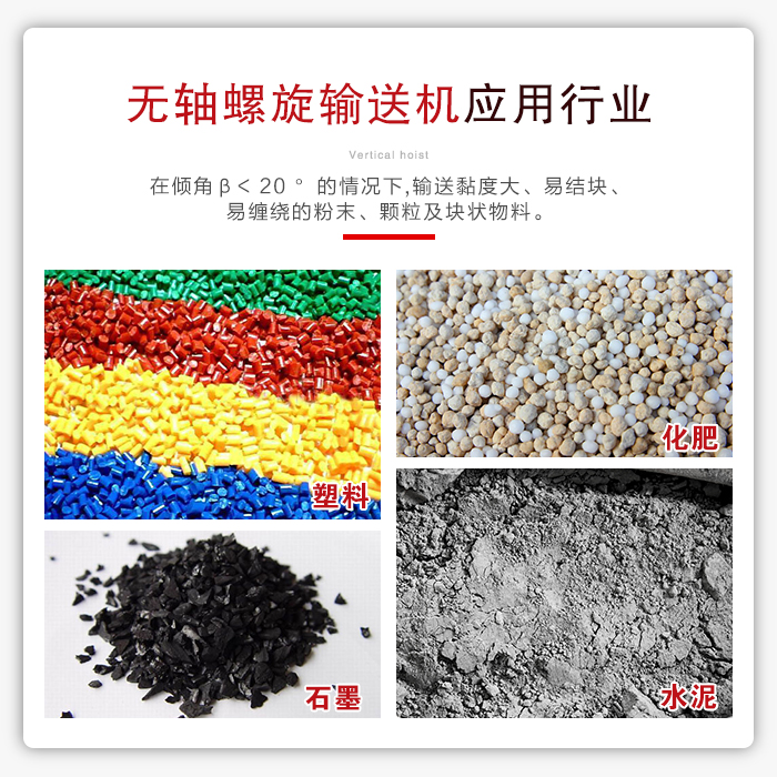 無(wú)軸螺旋輸送機(jī)廣泛用于食品、醫(yī)藥、化工、 建筑等部門,在傾角β< 20 °的情況下,輸送黏度大、易結(jié)塊、易纏繞的粉末、顆粒及塊狀物料。